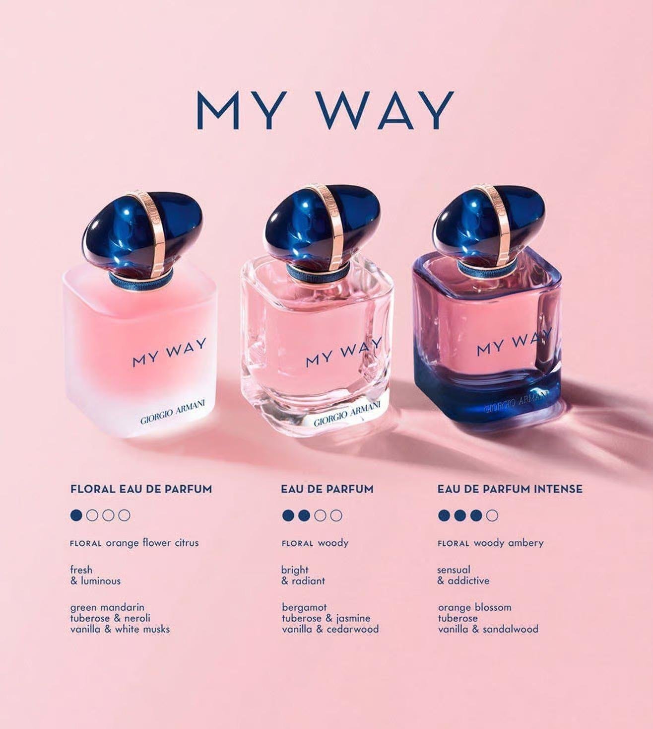 This rich, opulent interpretation of My Way's contemporary floral signature is an invitation to live life intensely. The My Way Intense bottle offers an innovative refill system for all bottle sizes. My Way Intense charts a new, sensual chapter within The My way universe. With its amplified floral heart and intense woody trail, My Way Intense Eau De Parfum offers a potent take on my way’s uniquely alluring signature. My Way Intense conjures a fusion of cultures, and spotlights some of the finest natural ingredients from around the world, taking the senses on a rich olfactory journey. In an instant, it captures encounters that are experienced with a new intensity. The essence of My Way Intense is its new, intense tuberose heart absolute from India, which boasts a floral, rich, and opulent quality. This note enhances and amplifies the modern, natural, and solar effect of the original tuberose absolute captured in the My Way Eau De Parfum. Taking the bright, white floral bouquet of Indian tuberose and jasmine that is my way’s beating heart, My Way Intense’s heightened florality makes this captivating heart beat even faster. My Way Intense opens with a bright luminosity, thanks to notes of bergamot heart from Calabria, Italy, and orange blossom from Egypt. At the heart are the two tuberose heart absolutes, composed of flowers hand-picked in the Indian region of Mysore. The creamy tuberose combines with jasmine grandiflorum super infusion, also from India and crafted for Giorgio Armani, which allows the perfumer to precisely select and refine the most feminine aspects of this note, alongside jasmine sambac. These notes create a sense of generosity and radiant femininity in the fragrance. My Way Intense’s base notes, meanwhile, reveal a sensual trail. Evocative and creamy sandalwood from the south pacific island of New Caledonia, fuses with creamy vanilla bourbon premium infusion from Madagascar, to create a fragrance that acts like a talisman, a reassuring touch on any journey, and a reminder of the experiences encountered there. A subtle reference to the world it encapsulates, the jewel-like cap is a powerful talisman, capturing the intensity of the transformative experiences that inspire My Way Intense. With innovations in design and eco-conception, my way intense is crafted to be refillable, with each bottle standing on its own as an elegant, more sustainable object that is designed to last. The My Way Intense refill bottle can be used to seamlessly refill all sizes of my way intense. Alongside this are the bottles and packaging’s recycled and recyclable materials, with the outer box crafter in recycled card and printed with vegetable-based ink. With its radiant, effervescent signature, Giorgio Armani’s feminine fragrance my way intense has reimagined the floral fragrance for a new generation.